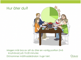Vissa äter för fort och andra kan sitta och peta i maten jättelänge. För magen är det bra om du äter en portion på 15-20 minuter. Då hinner du också prata med någon vid bordet och ha en trevlig stund ihop. Om du äter väldigt fort kan du träna på att sakta ner – man kan ta mindre tuggor, tugga längre och ibland lägga ner besticken och prata lite. Äter du väldigt sakta kan du träna på att äta lite fortare – det går att träna upp det med.